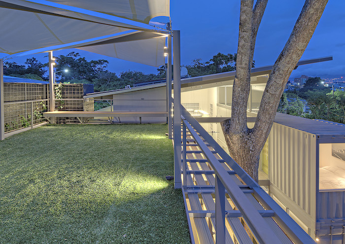 Hier ist ein haus aus einem metall container mit einer terrasse mit grass und einem baum
