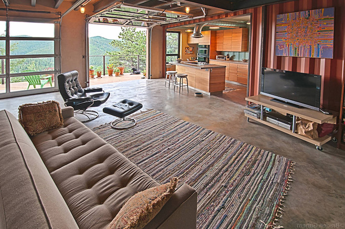 Hier ist ein zimmer eines container hauses mit einem teppich sofa tv und stühlen