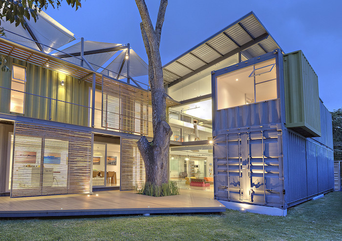 Jetzt finden sie hier ein sehr schön aussehendes container haus aus einigen conteinern aus metall und mit einem garten mit einem baum