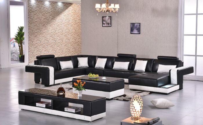 Designer sofa aus leder in schwar und weiß kissen wohnzimmer tisch couch tisch wohnzimmerdeko