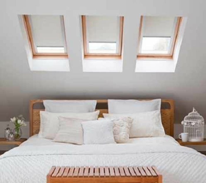Dachfenster Rollo im Schlafzimmer mit einem großen Bett