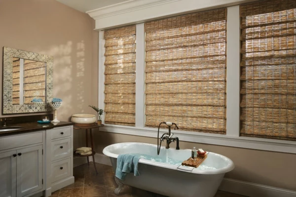 - Die praktische Jalousie: Unschlagbar, wenn du Licht und Sicht stufenlos regulieren willst. Lamellen einfach kippen und schon kommt Licht rein, ohne dass dir jemand auf den Teller… ähm, in die Wanne schaut. WICHTIG: Im Bad kommen nur Jalousien aus Aluminium oder Kunststoff (PVC) infrage. Holzjalousien sind hier ein absolutes No-Go!
