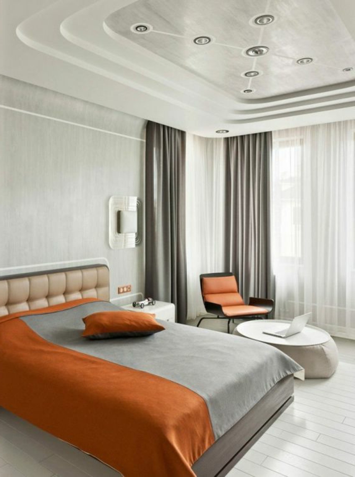 Fenstergestaltung graue vorhänge schlafzimmer stuhl bett kisse nachttisch fenster