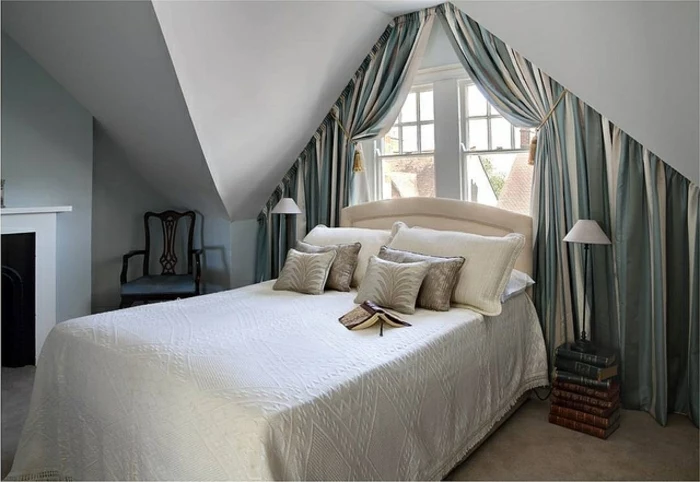 Die besondere Form des Dreiecksfensters lädt zum Spielen mit Licht ein. Statt es komplett zu verdunkeln, kann ein halbtransparenter Stoff die Architektur betonen. Stellen Sie sich einen leichten Leinenstoff vor, der das harte Morgenlicht in einen weichen, diffusen Schein verwandelt und den Raum in eine ruhige, fast sakrale Atmosphäre taucht. Hier geht es weniger um komplettes Blockieren als um das kunstvolle Filtern und Formen des Lichts.
