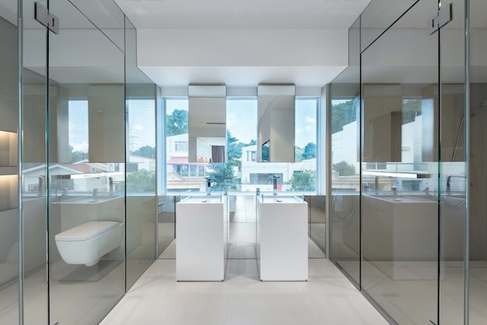Ein badezimmer mit einem kleinen weißen waschbecken ein fenster und zwei spiegel zimmer mit durchsichtigen wänden ein haus einrichten