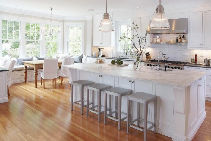 Laminat küche theke barstühle grau eckfenster esstisch massiv hol fenstercouch ikebana weiße küchenfronten