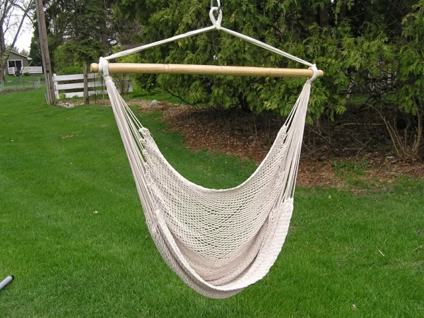 Die mit den Holzstäben an beiden Enden. Sieht aus wie ein schwebendes Bett und ist toll zum Sonnenbaden. Aber Vorsicht: Die Dinger sind notorisch kippelig! Eine falsche Bewegung, und du landest auf dem Hosenboden. Ich hatte mal einen Kunden, der wollte ganz lässig sein kühles Bier genießen und fand sich mitsamt allem auf dem Rasen wieder. War eine lustige Geschichte für uns, aber er hat sich danach für eine stabilere Tuchhängematte entschieden. Stabhängematten brauchen eine sehr straffe Aufhängung, um halbwegs stabil zu sein.