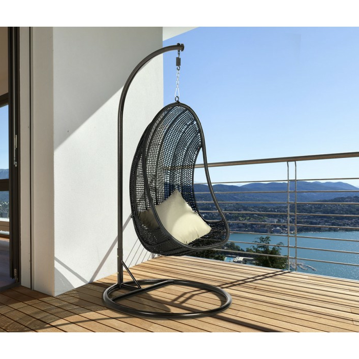 Hängesessel mit gestell auf der terrasse schwarz weiß kissen