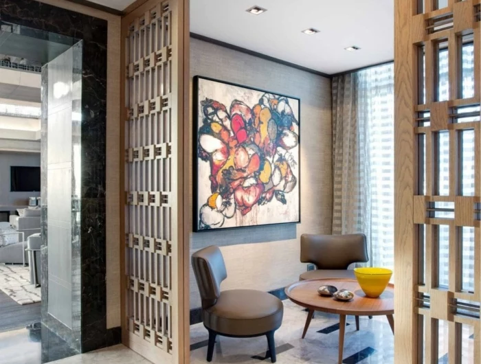 Das Geheimnis? Vertikale Holzlatten! Mit einem Abstand von 2-5 cm montiert, bieten sie Privatsphäre aus bestimmten Blickwinkeln, während sie von der Seite fast transparent wirken. Perfekt für den Eingangsbereich oder zwischen Wohn- und Esszimmer.