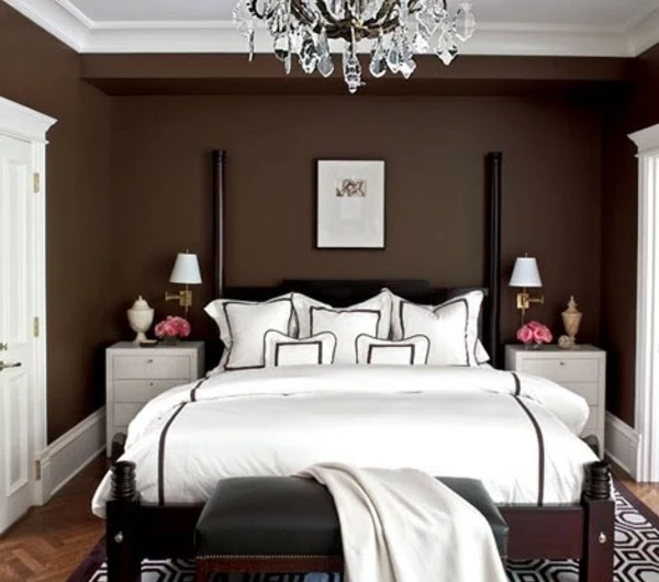 Dunkles Schoko- oder Kaffeebraun ist ein Statement! Am besten wirkt es als Akzentwand hinter dem Sofa oder dem Bett. Es verleiht dem Raum eine unglaubliche Tiefe. Wichtig ist hier aber viel natürliches oder künstliches Licht, sonst kann es erdrückend wirken.