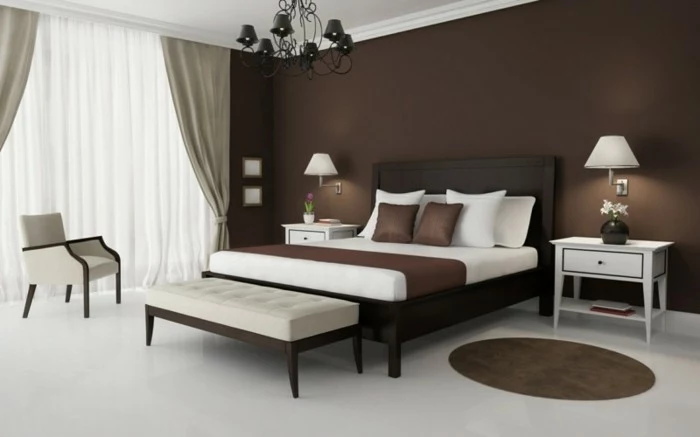 - Ein sattes Schokoladenbraun liebt helle Hölzer wie Eiche, cremeweiße Textilien und Akzente aus Messing oder warmem Gold.