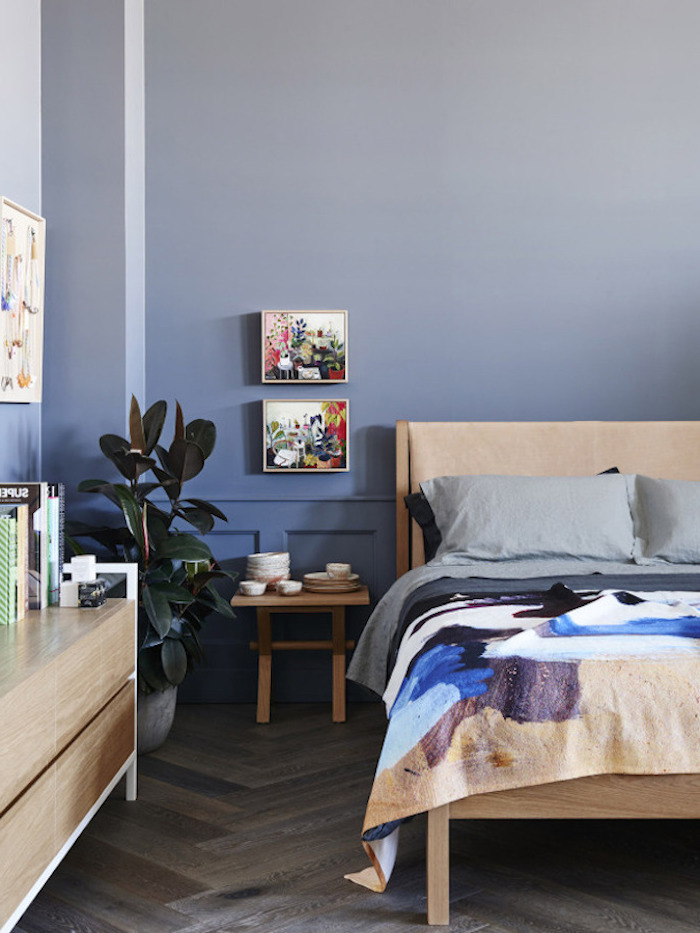 Schlafzimmer ombre wand doppelbett holzrahmen schlafdecke print parkett holzkommode