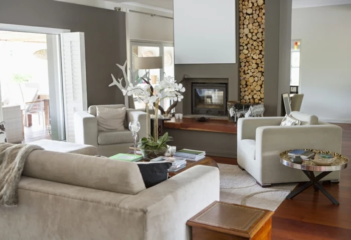 Wohnwand mit Holzoptik, graue Sessel, ein Kamin, selber bauen Ideen für Wohnzimmer