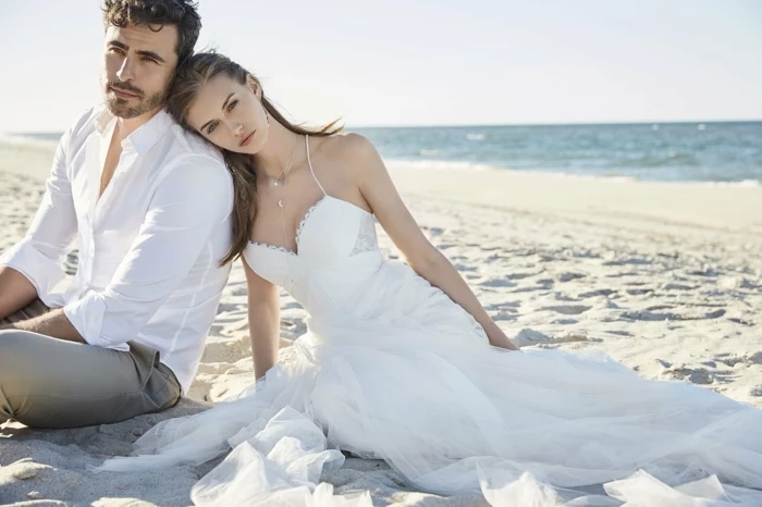 Strandhochzeit: Leichte, luftige Stoffe wie Chiffon oder Baumwollspitze. Ein Kleid mit Beinschlitz verhindert, dass du im Sand stolperst.