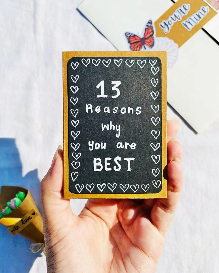 - Kleben Sie die letzte Karte auf die Schachtel und schreiben Sie darauf “13 Gründe, warum ich dich liebe“.