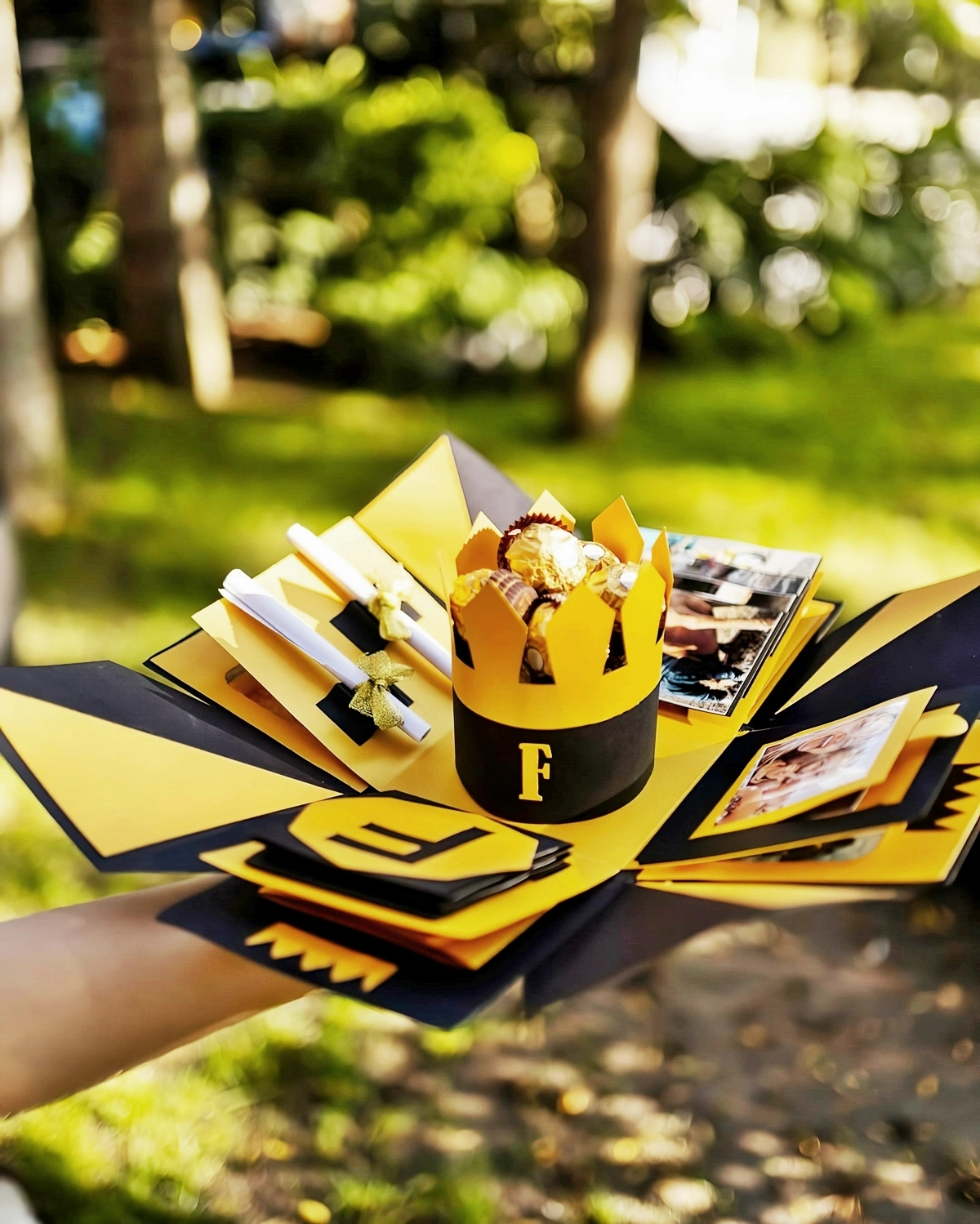 - Wenn Ihr Mann die Box öffnet, fallen die Seiten herunter und die Bilder erscheinen! Kreativ, oder?