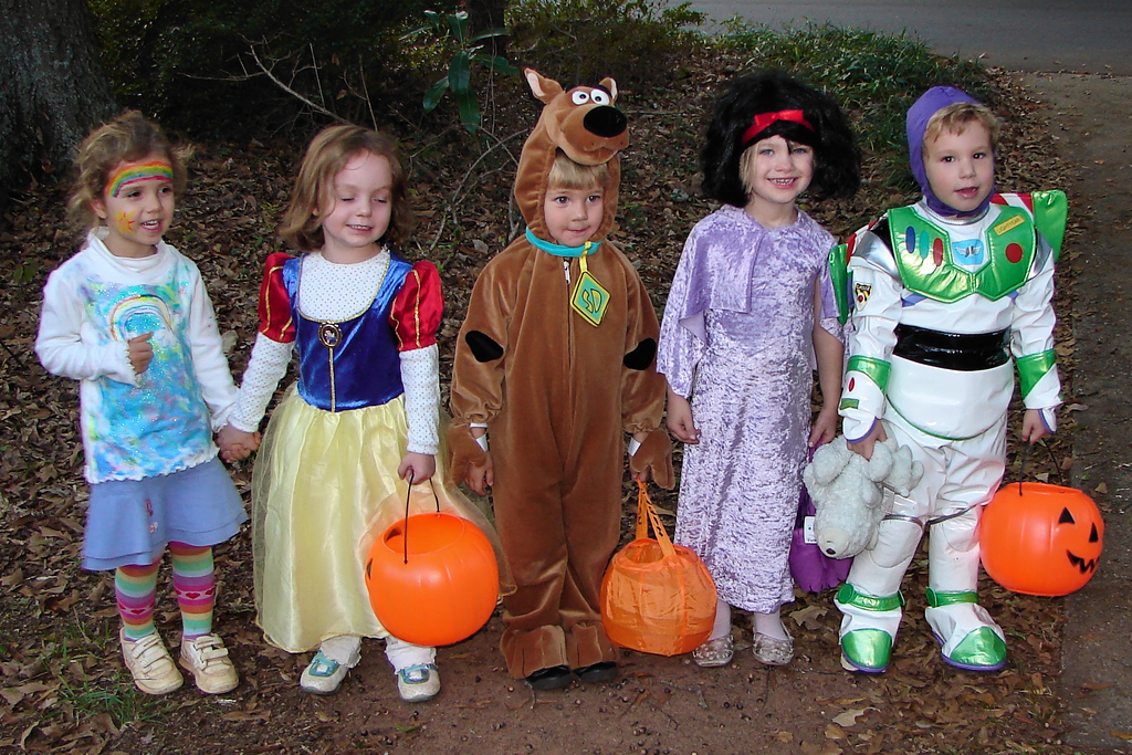 Bilder zu halloween eine niedliche gruppe von kostümierten kinder mit orangen körbchen zum sammeln