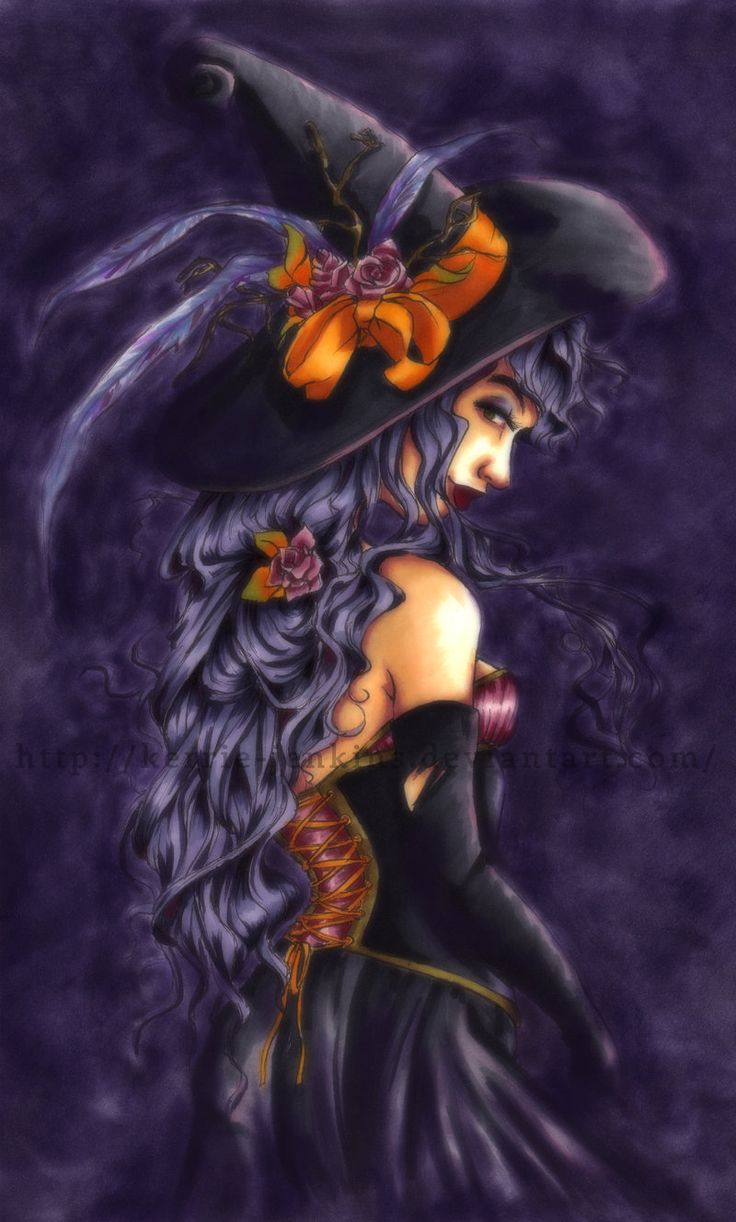 Gruselige halloween bilder eine hexe mit lila haar und schwarzes kleid blumen in den haaren