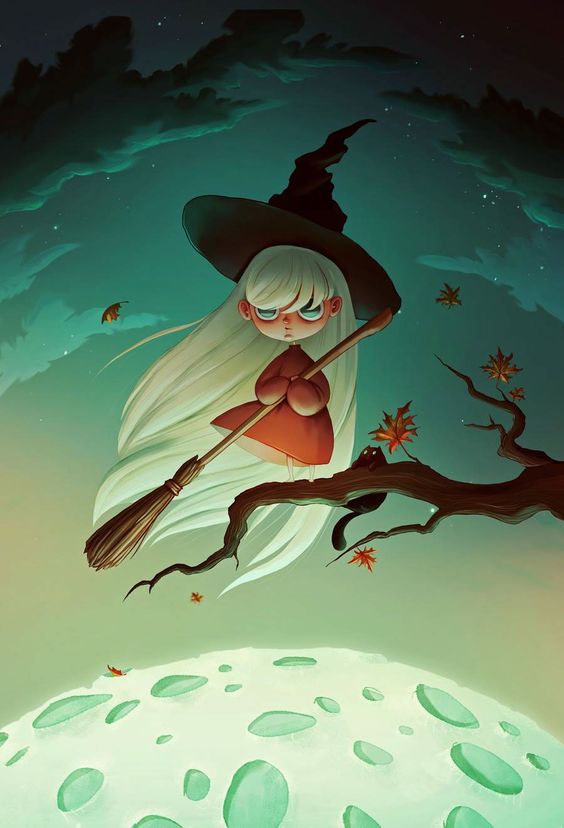 Gruselige halloween bilder eine kleine hexe erholt sich auf einem zweig mit ihrer besen