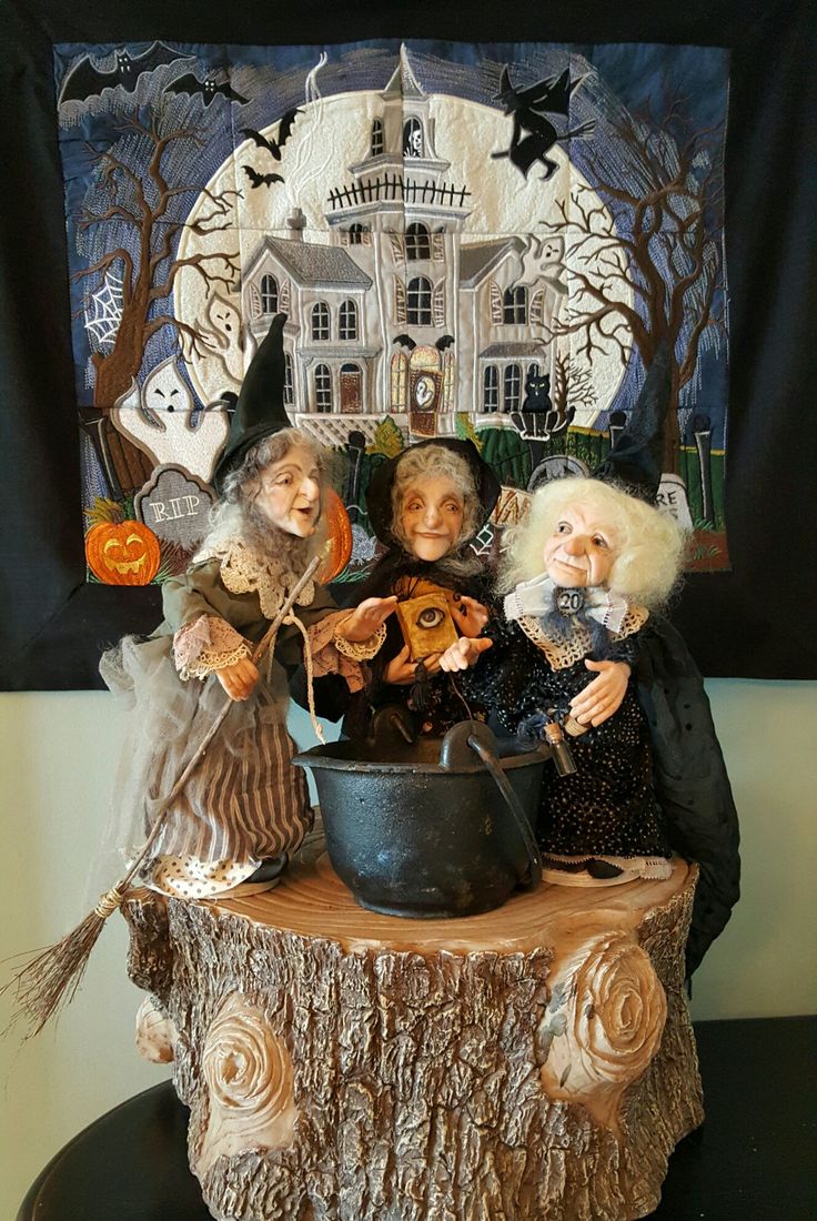 Gruselige halloween bilder halloween dekoration drei hexen um einem kessel auf einem stamm
