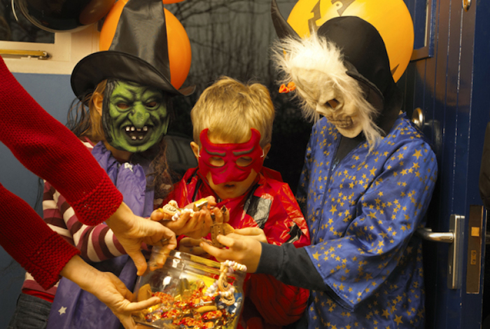 Bilder zu halloween drei verkleidete kinder mit gruseligen masken die treats verlangen