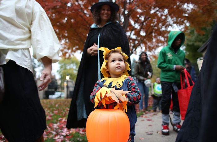 Bilder zu halloween ein kleines kind wie strohpuppe verkleidet ist süß während es süßigkeiten sammeln