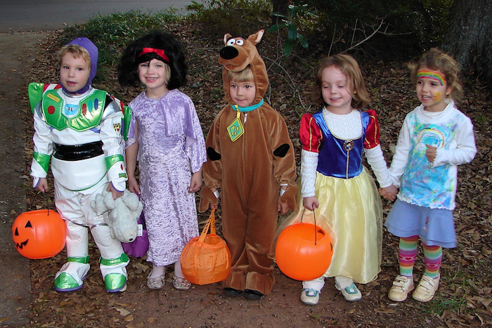 Bilder zu halloween eine niedliche gruppe von kostümierten kinder mit orangen körbchen zum sammeln