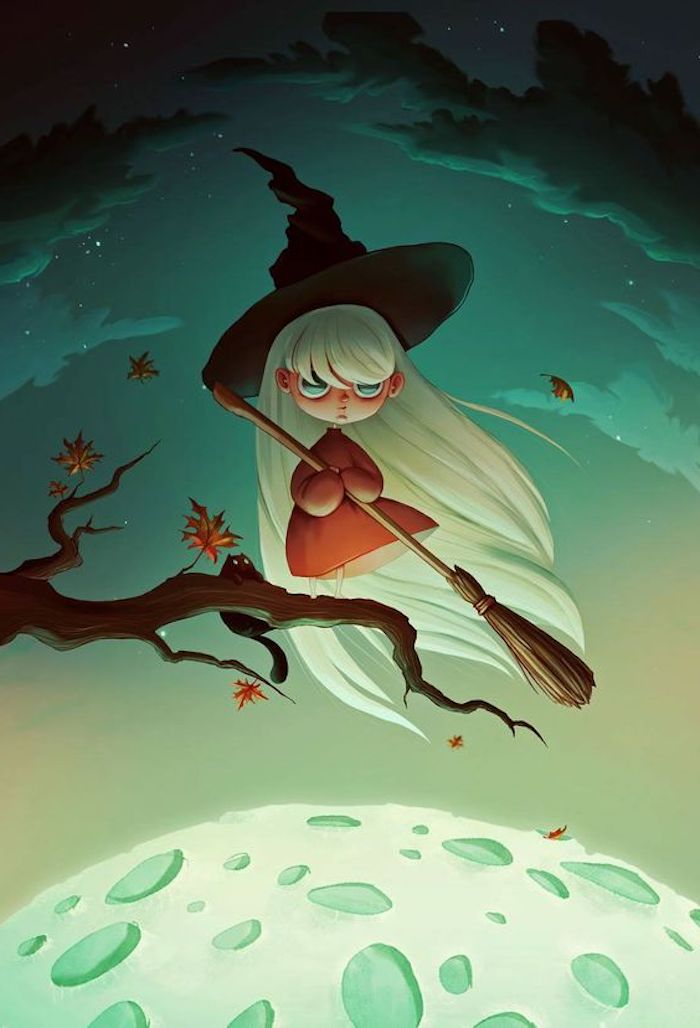 Gruselige halloween bilder eine kleine hexe erholt sich auf einem zweig mit ihrer besen