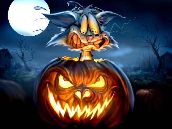 Halloween hintergrund ein böser kopf von halloween kürbis der die katze gegessen hat