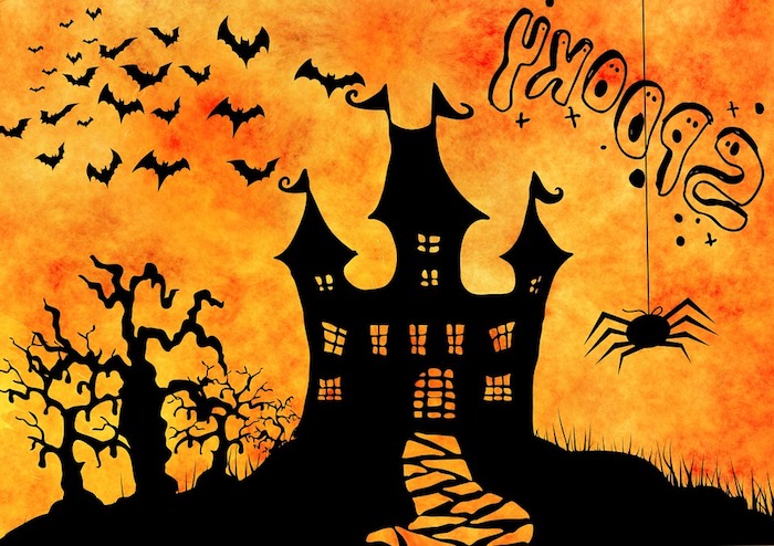 Halloween hintergrund ein schloss voller gespenster und viele fledermäuse gruselig geschrieben