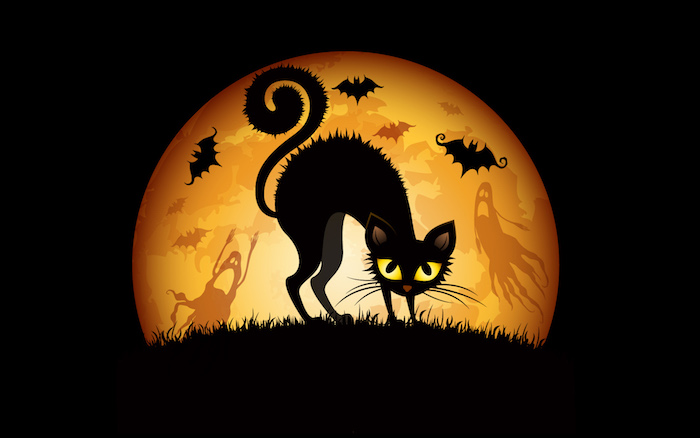 Halloween hintergrund eine schwarze katze mit voller mond im hintergrund drei fledermäuser