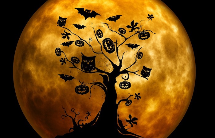 Happy halloween bilder ein halloween baum mit gruseligen figuren mond im hintergrund