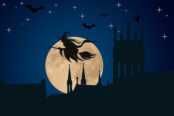 Schöne halloween bilder eine hexe auf besen fliegt in der nacht mit vollmond