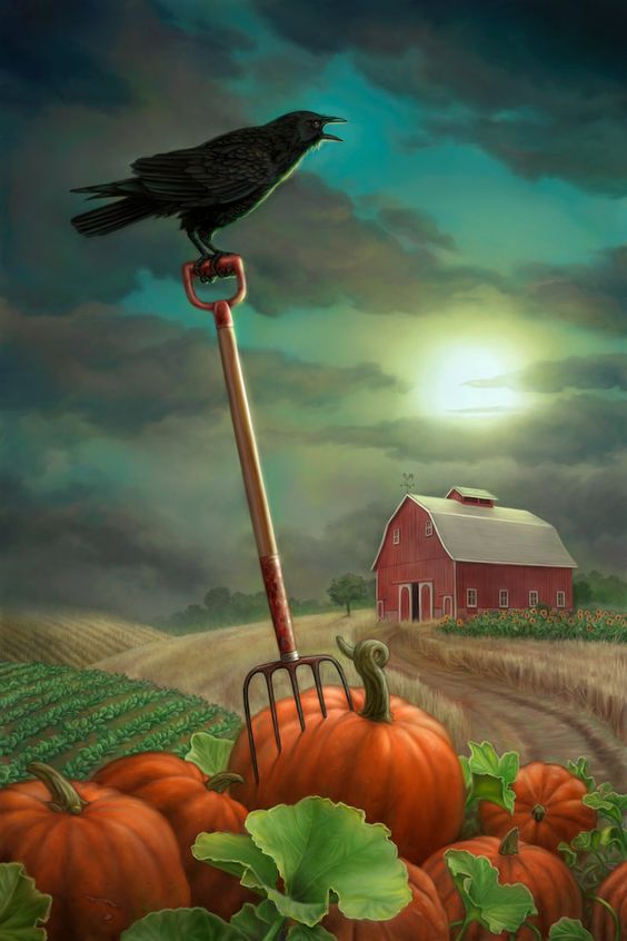 Bilder halloween ein herbstliches bild mit einem raben über die kürbisse landhaus im hintergrund