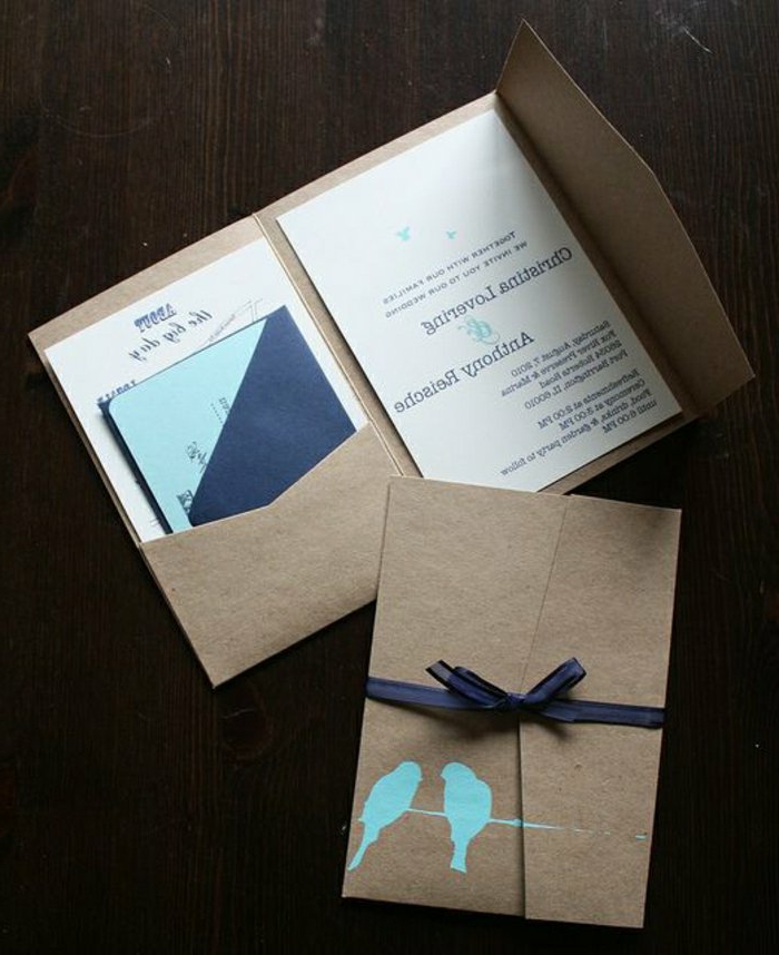 Einladungskarten selbst gestalten Liebesvögel Zeichnung dunkelblaues Band