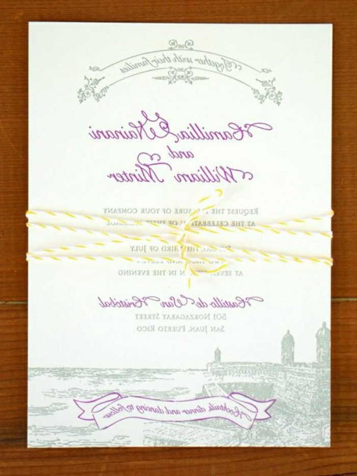Einladungskarten selbst gestalten lustige Schrift lila Farbe gelbe Schnur