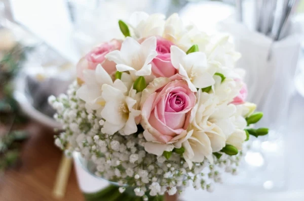 - Beim Essen: Der Brautstrauß gehört niemals auf den Esstisch! Er nimmt zu viel Platz weg und sein Duft kann das Aroma der Speisen stören. Eine Vase auf einem Beistelltisch ist der ideale Platz.