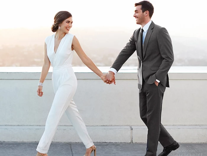 festlicher jumpsuit für die dame und grauer anzug für den mann ehepaar neu geheiratet schöne ideen verliebtes paar