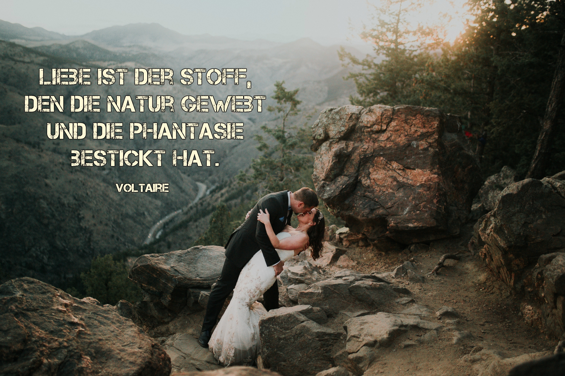 Inspirierende hochzeitssprüche von voltaire und ein sich küssendes brautpaar in der wilden natur