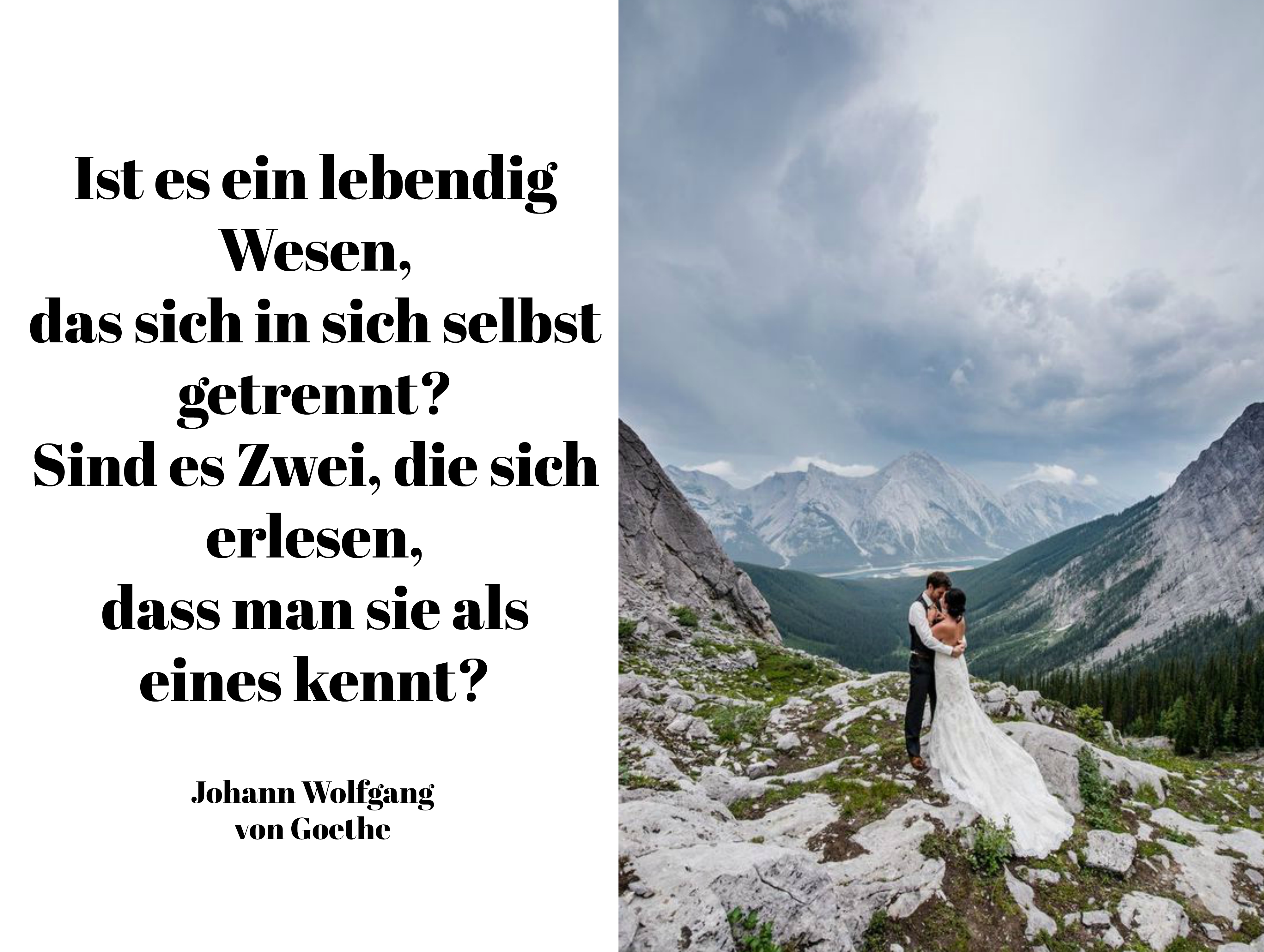 Jetzt zeigen wir ihnen ein bild mit einem brautpaar und einer frau mit einem schönen weißen brautkleid und eine der hochzeitssprüche von goethe