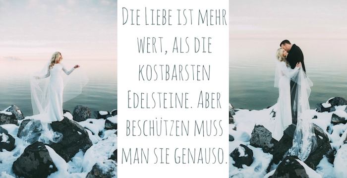 Bilder mit schnee und ein brautpaar und see und steinen und einer jungen frau mit einem weißen brautkleid und einem tollen hochzeitsspruch