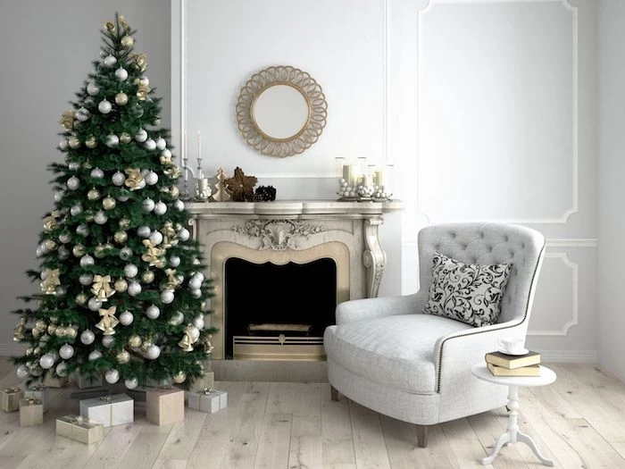 Weiße Einrichtung und Holzboden, echter Weihnachtsbaum mit weißen Christbaumkugeln