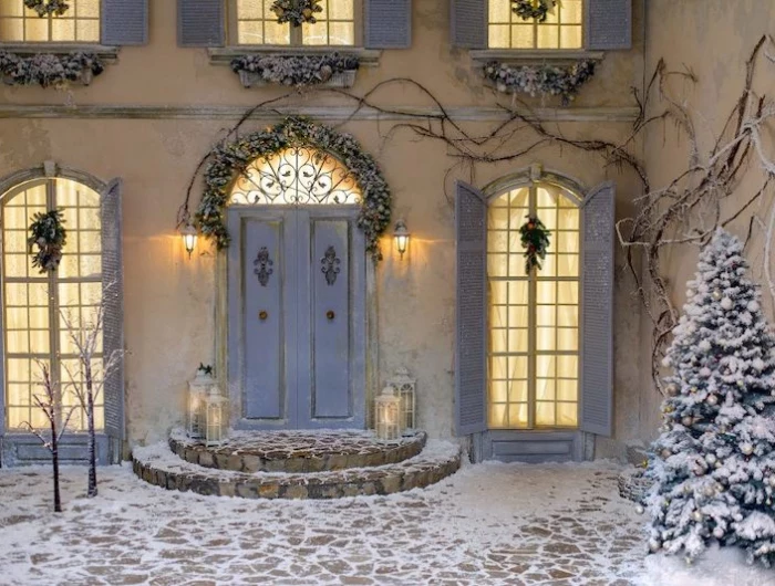 hauseingang treppe weihnachtsdekoration haustür tannengirlande und kranz