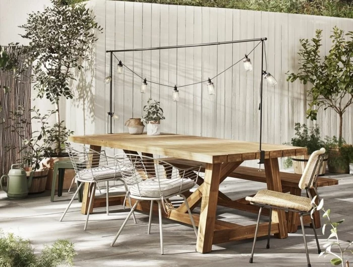Gartengestaltung Sichtschutz Beispiele, Gartenzaun in weiß aus Holz, Holztisch mit Stühlen, kleine Bäume