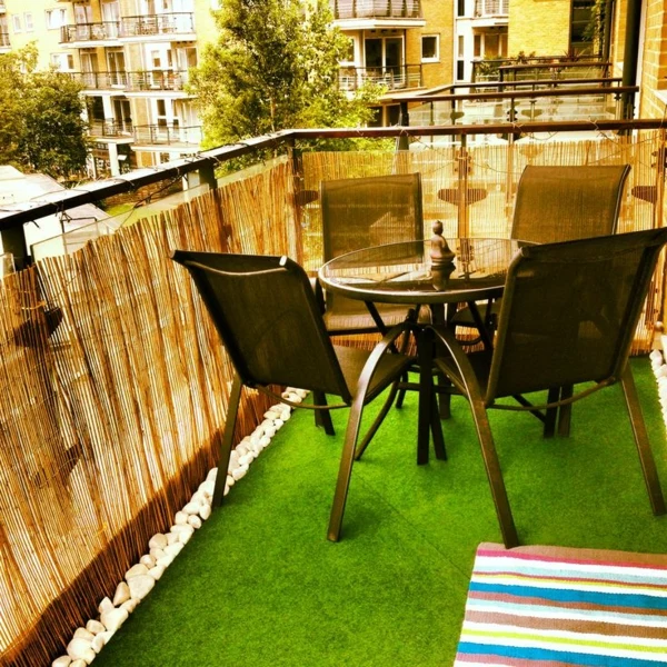 Denken Sie vertikal! Ein Rankgitter aus dicken Bambusrohren, an dem Kletterpflanzen wie Clematis oder Prunkwinde emporwachsen, schafft einen lebendigen, grünen Sichtschutz und nutzt den begrenzten Raum auf dem Balkon optimal aus. Es ist eine einfache Möglichkeit, eine natürliche und dynamische Wandgestaltung zu realisieren.