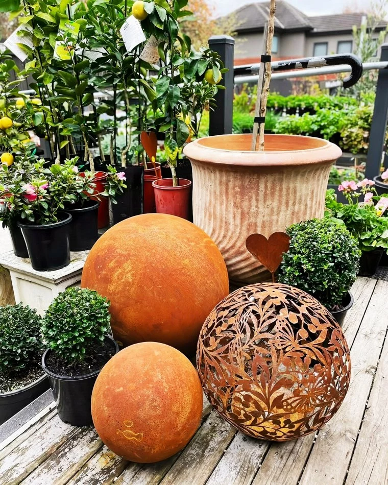 Dekokugeln oder Bälle mit Ringen sind eine sehr trendige Rostdeko für den Garten. Rostiges Metall hat eine rohe und warme Seite, die bei behandeltem Stahl nicht vorhanden ist. Positionieren Sie sie auf eine Säule, damit sie ihre volle Wertigkeit erhalten.