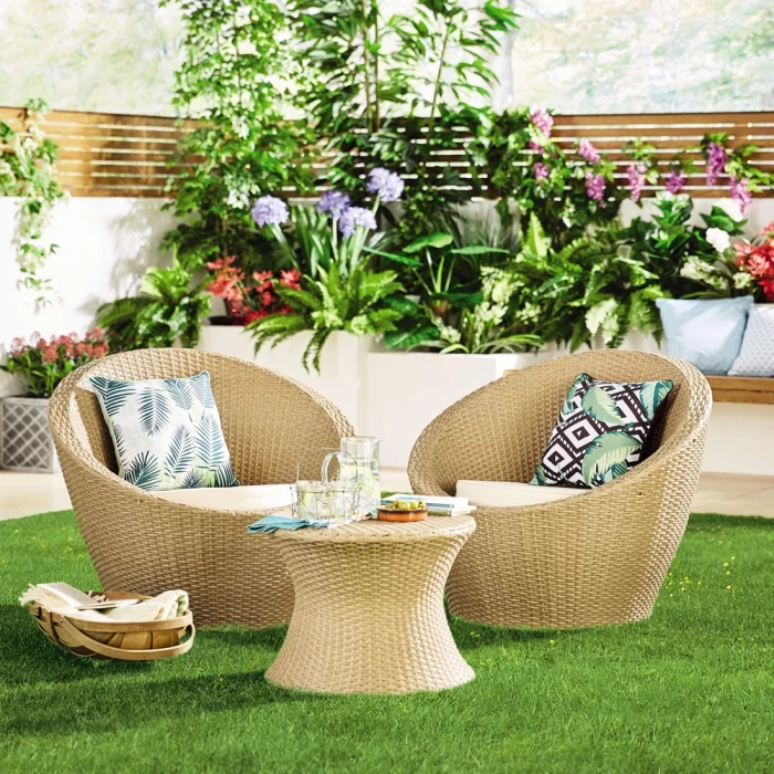 Gartenmöbel trend 2019 moderne außenmöbel aus rattan bunte dekokissen kleiner runder tisch