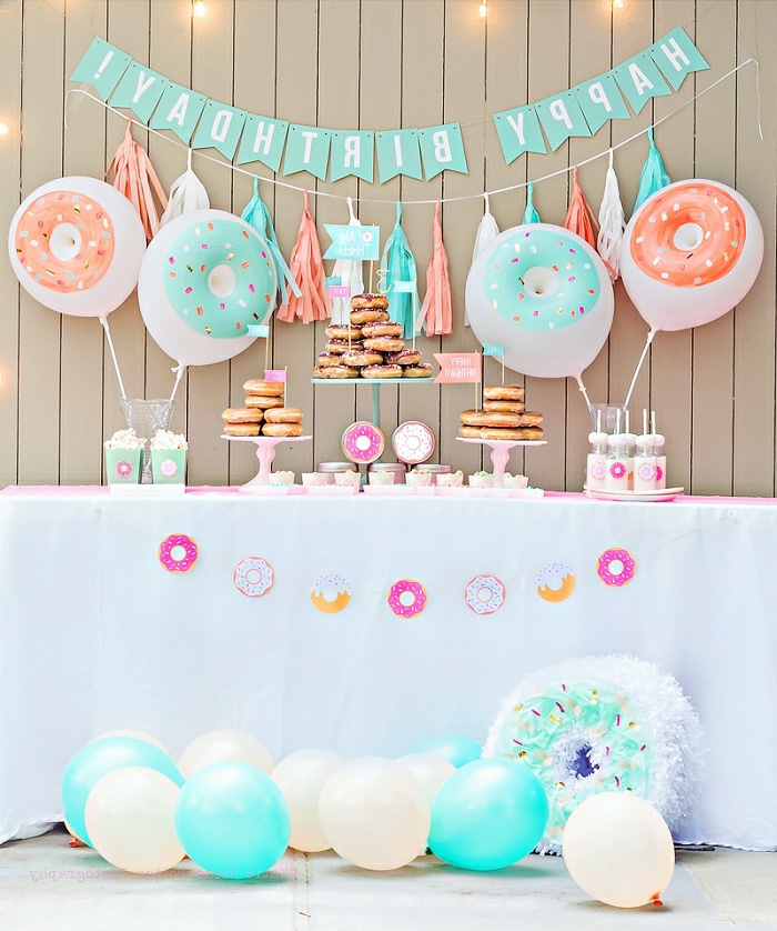 deko geburtstag zu hause balloons baloon dekorationen am tisch und frische blumen darauf
