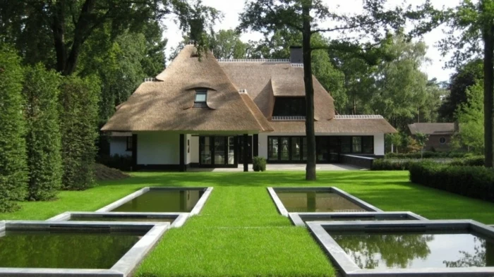 ein Wasserspiegel mit drei Fliesen in der Mitte, englischer Rasen - Gartengestaltung Beispiele