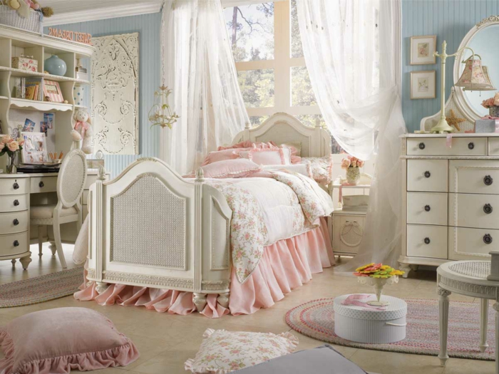 Shabby chic bilder bett mit weißen gardinen